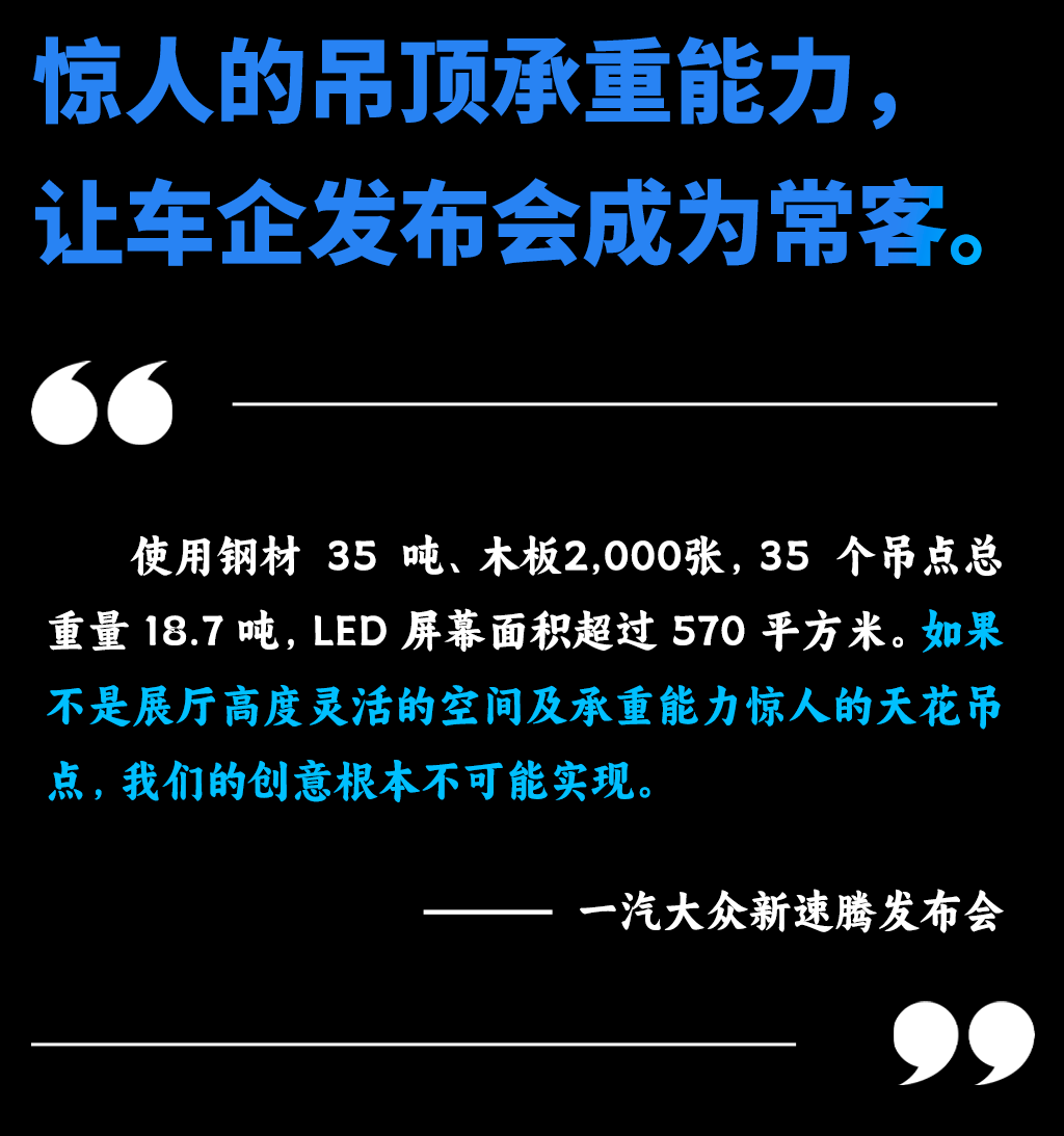 依托展厅40个天花吊点且每个吊点可承重1吨的独特硬件优势,为大家成功呈现了一场如梦如幻的新车发布会。